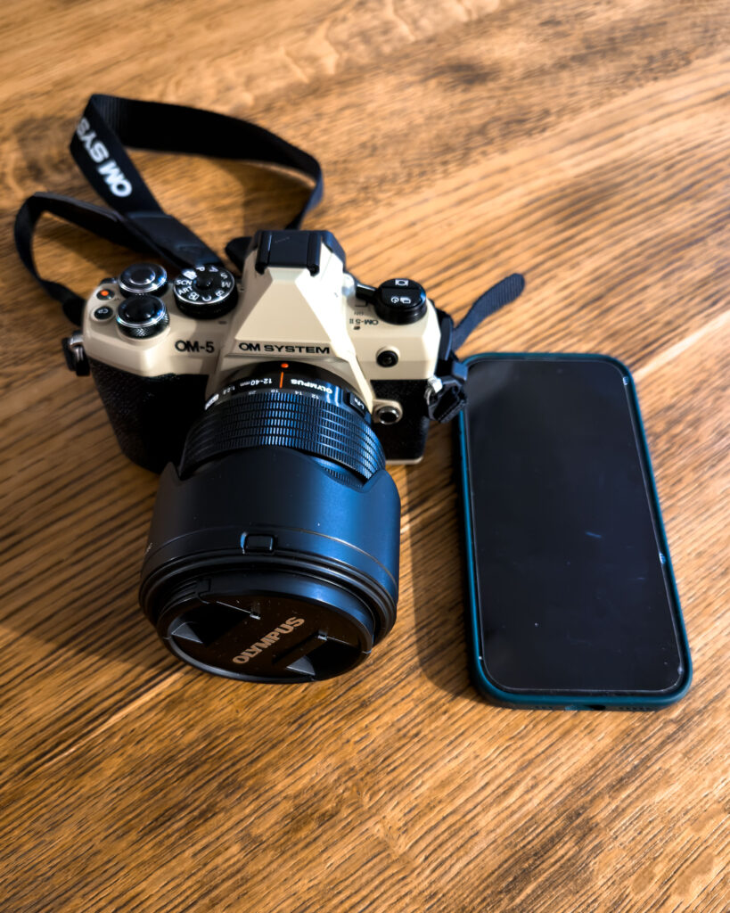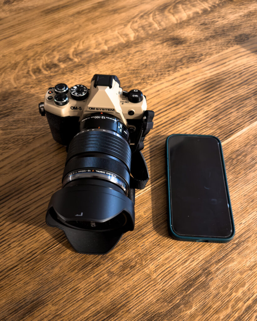 De notre côté, l’appareil qui nous suit en permanence, c’est l’OM System OM-5 Mark II avec le 12-40 mm f/2.8 (polyvalent, lumineux et idéal pour la majorité des situations) ou le 12-100 mm f/4, parfait lorsque l’on veut capter à la fois de larges panoramas et des scènes plus éloignées, tout en évitant de multiplier les optiques. Il reste toutefois un peu plus lourd est encombrant. Pour ordre d’idée voici deux photos avec un Iphone 15 à coté pour vous donner une idée de gabarit.