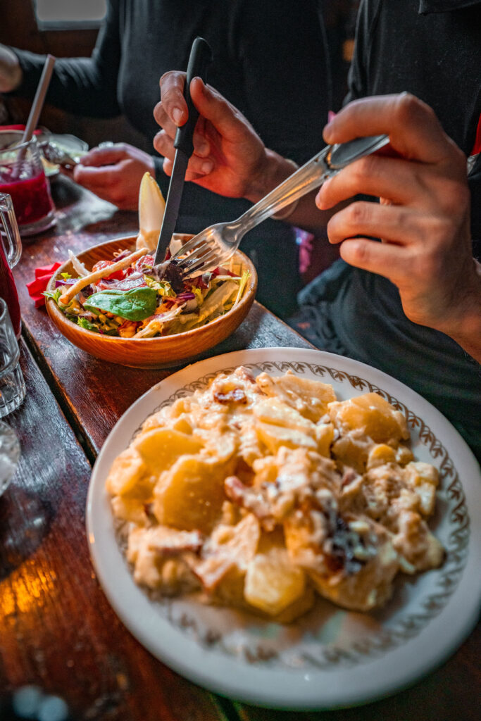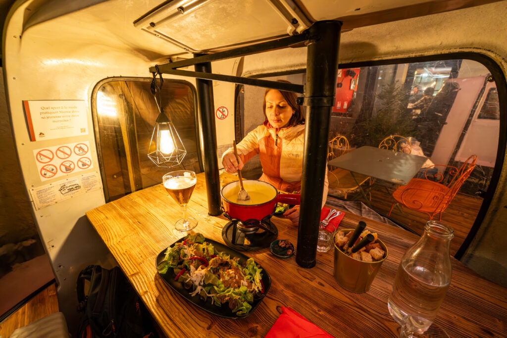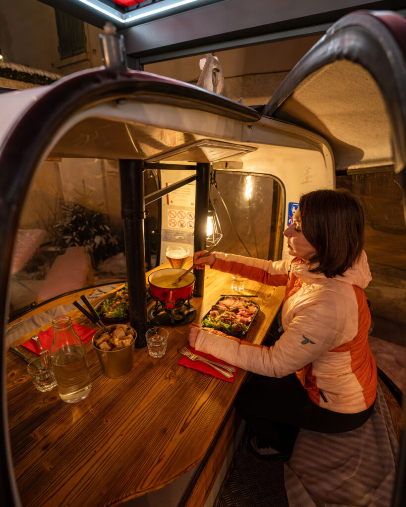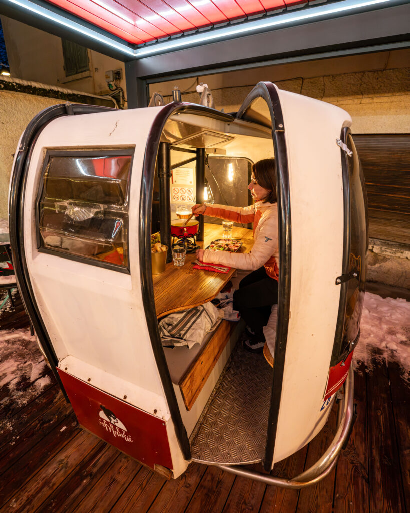 Pour finir cette journée, à Villard-de-Lans, le restaurant Chez Mamie propose une expérience aussi conviviale qu’insolite : dîner dans une ancienne télécabine. Nous ne pouvions pas passer à coté de cette adresse originale où l’on partage un repas dans un cadre atypique, parfait pour une soirée différente lors d’un séjour dans le Vercors. Au menu, plats montagnards, de pays et surtout un moment de déconnection. En tant que grand fan de fromage, la fondue était une évidence !