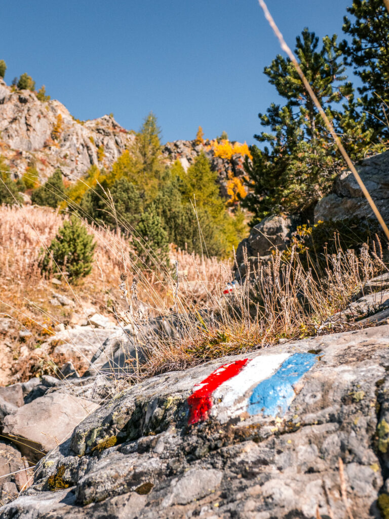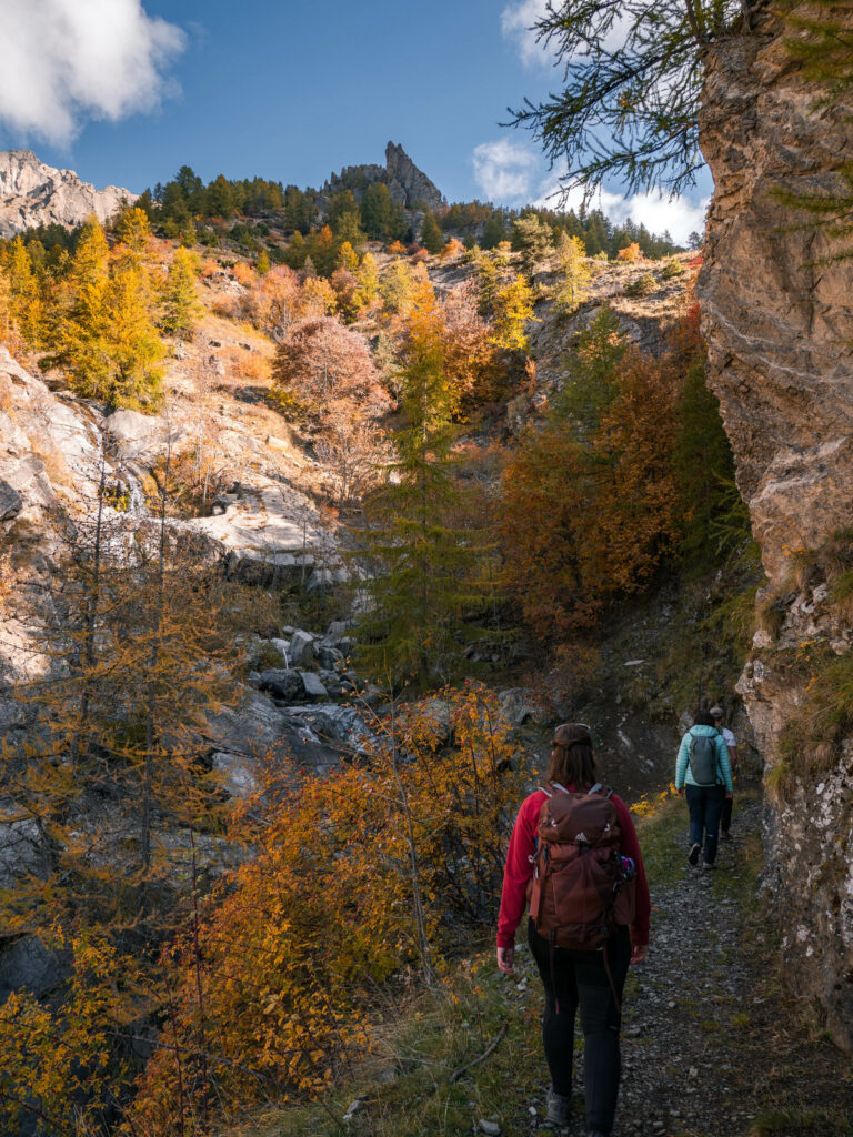 Le départ se fait au-dessus du hameau des Richards, sur une petite piste forestière. Rapidement, le sentier quitte la piste pour devenir un vrai chemin de montagne, montant régulièrement à travers une belle forêt de mélèzes. En automne, les aiguilles dorées se mêlent au vert sombre des épicéas et au rouge des sorbiers : un décor féérique.