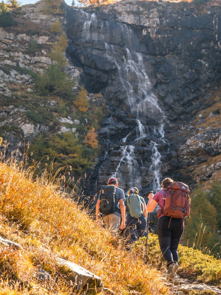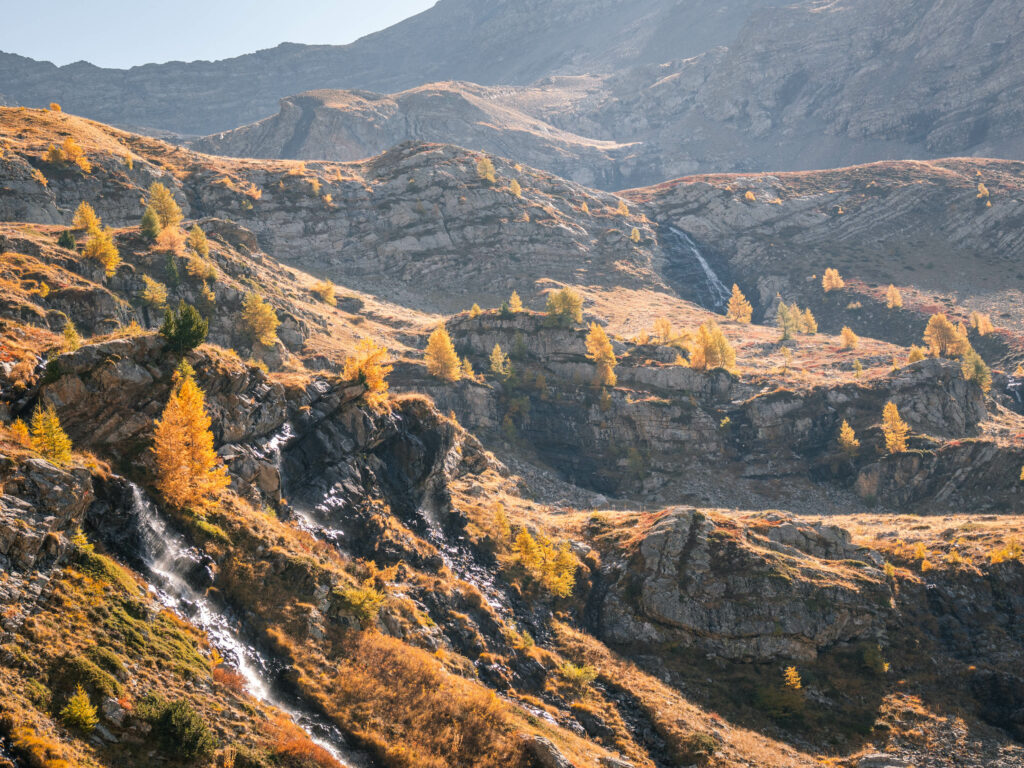 La suite de la montée s’effectue à découvert, avec un panorama qui s’élargit peu à peu sur la vallée.On pénètre dans une sorte de cirque minéral, ponctué de cascades, de sources et de prairies roussies par l’automne. Les contrastes sont saisissants : la roche grise, les herbes rouges et les lumières dorées créent une atmosphère presque irréelle.