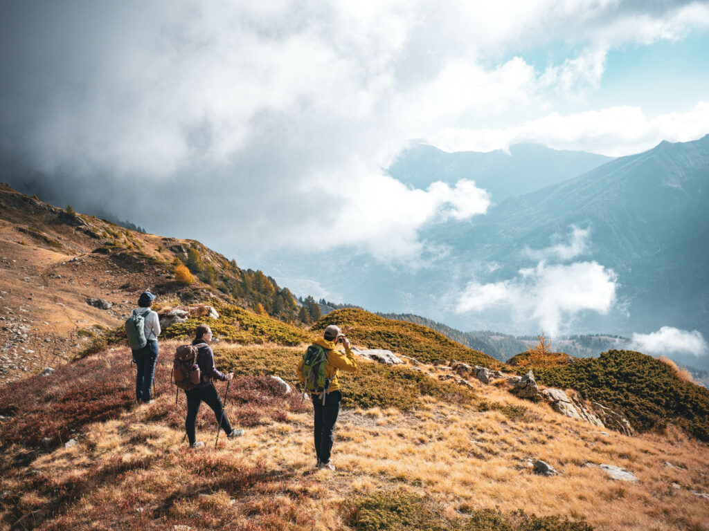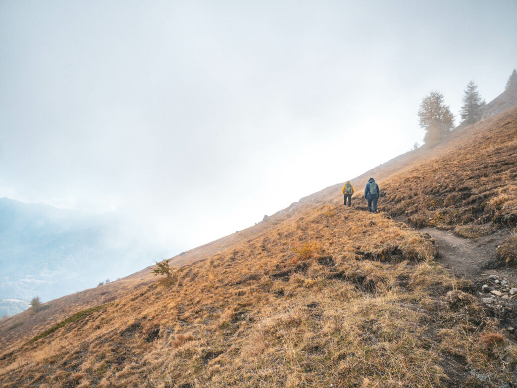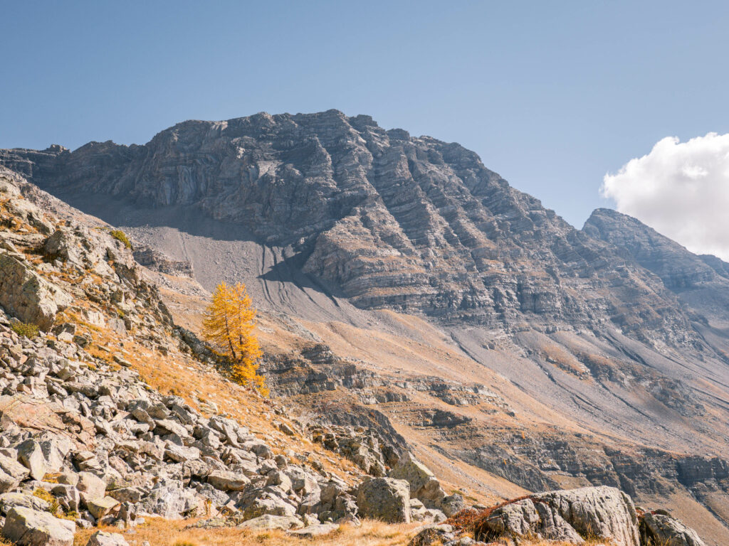 Le sentier débute tranquillement, serpentant au milieu des forêts de feuillus et de mélèzes, encore verts à certains endroits, mais déjà bien dorés à d’autres. C’est l’un de ces chemins où chaque virage dévoile un nouveau tableau d’automne : feuilles rouges, tapis orangés, odeur d’humus et de bois humide. Après une bonne heure et demie d’ascension, les arbres s’écartent, et le Méollion se dévoile.