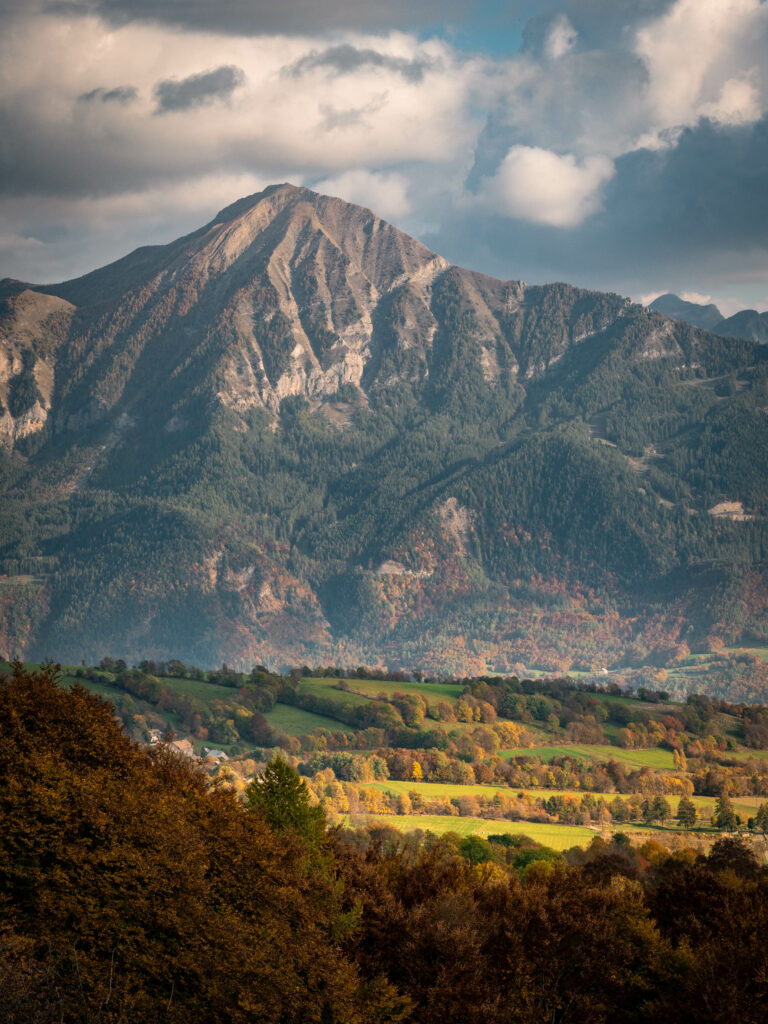 À l’automne, les couleurs explosent : les prairies blondissent, les haies s’enflamment de rouge et d’orange, et au loin, les sommets des Écrins ou le Devoluy dominent.